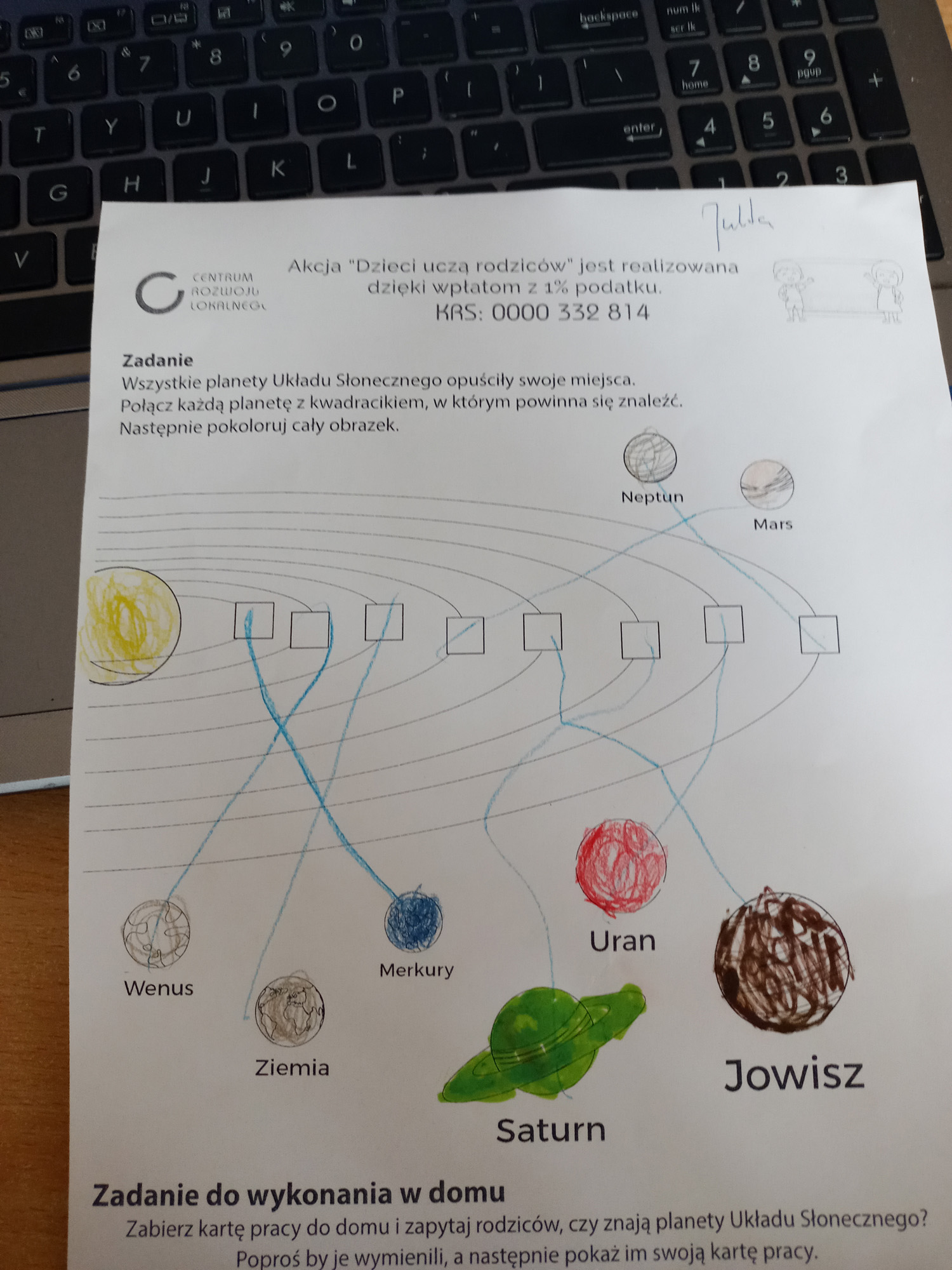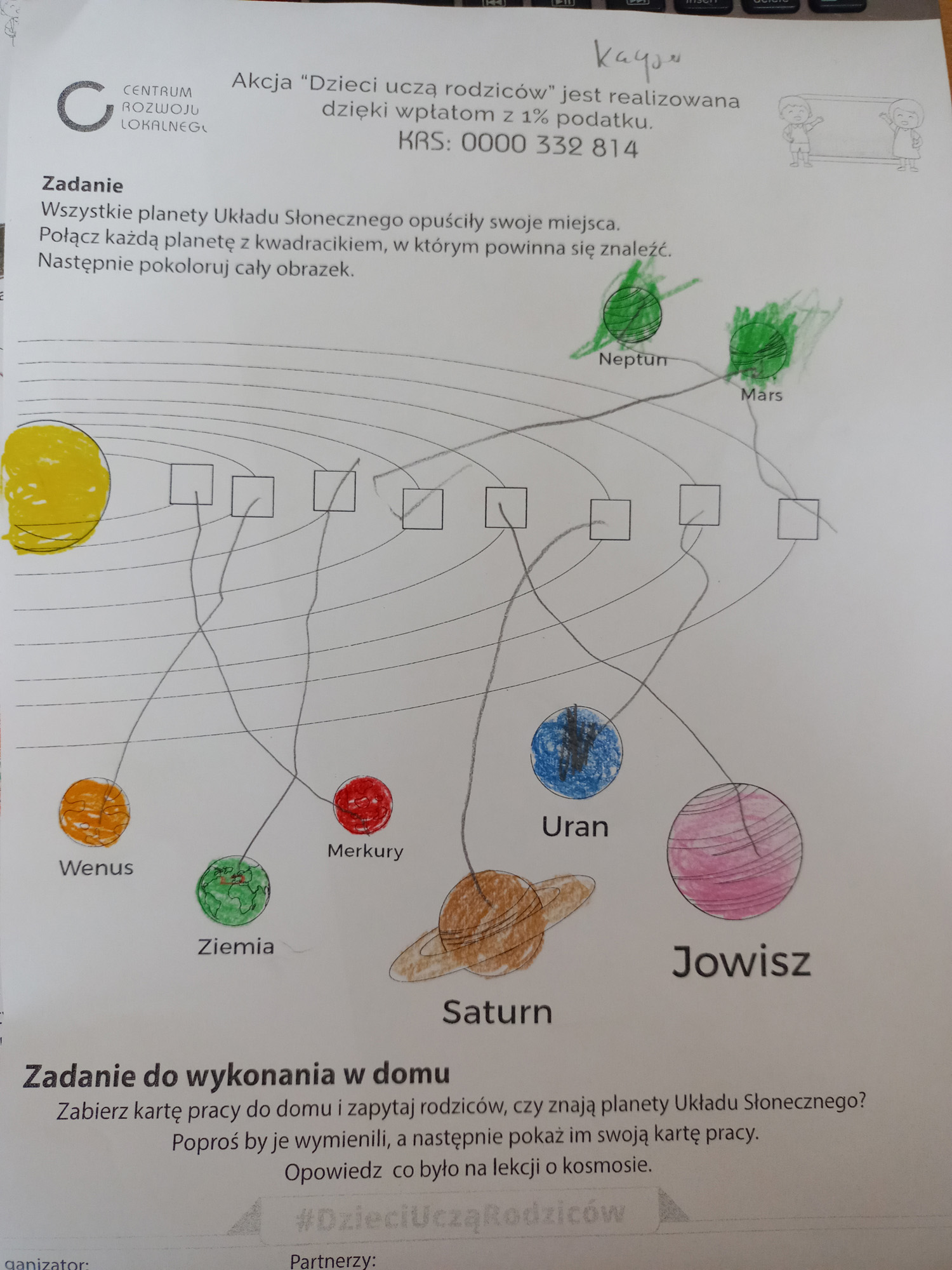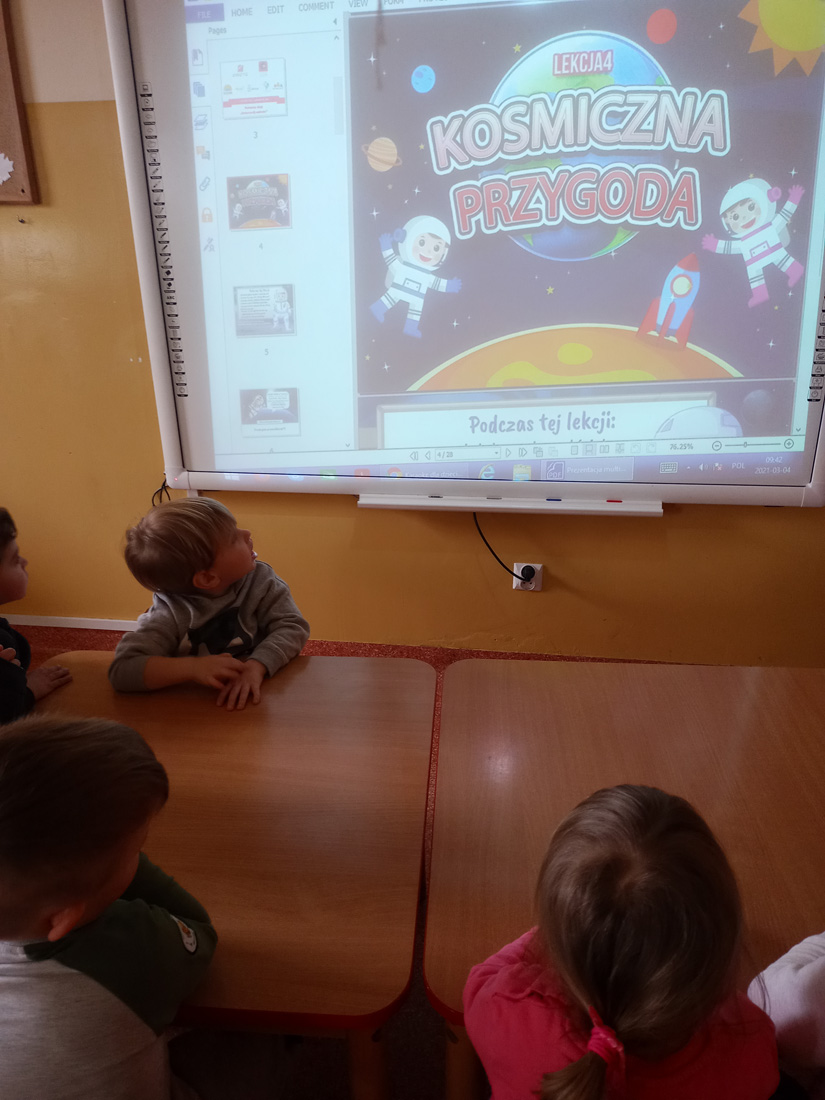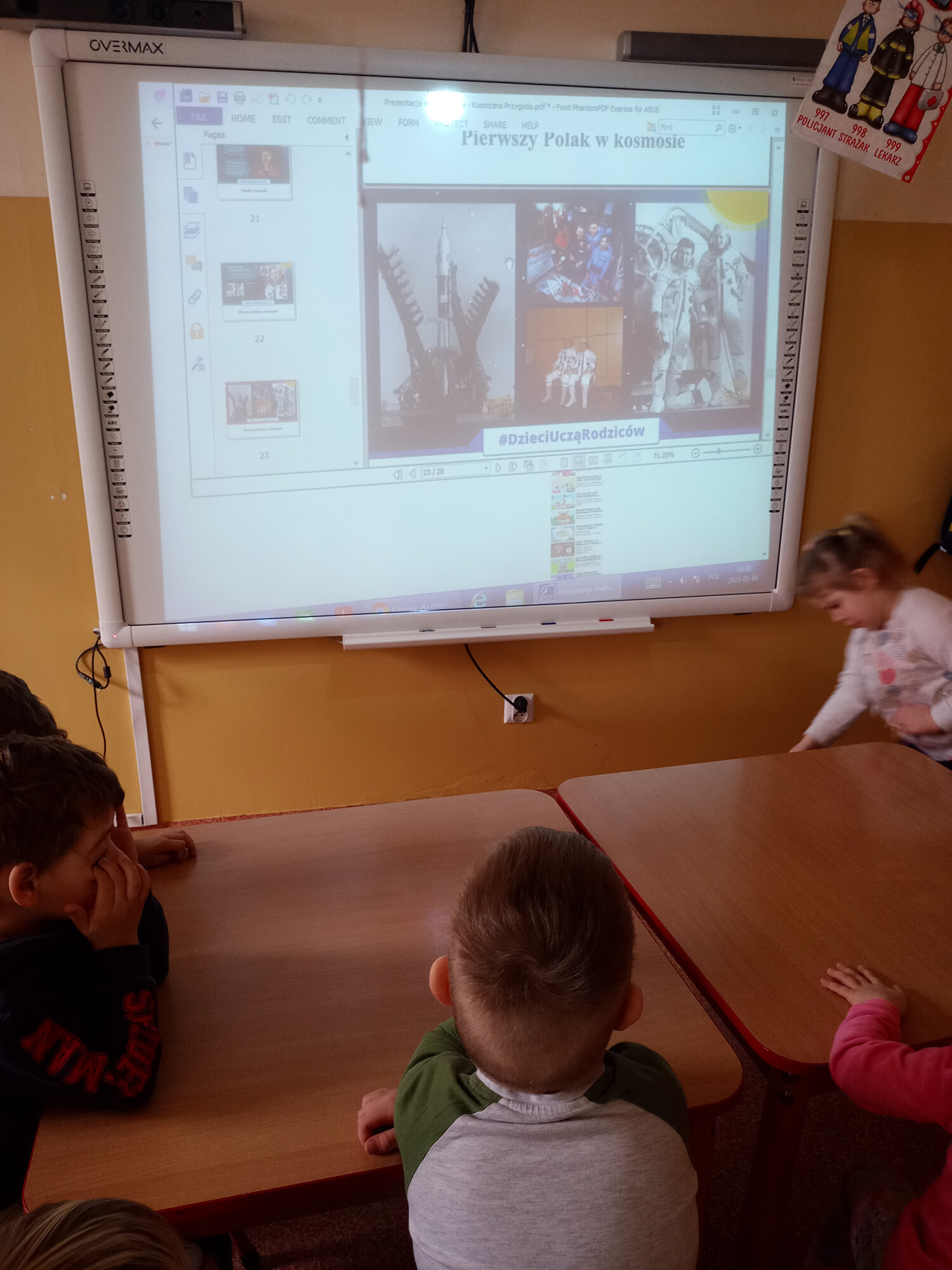 W naszym przedszkolu, w ramach akcji "Dzieci uczą rodziców" zrealizowana została kolejna lekcja. Przedszkolaki z zainteresowaniem obejrzały prezentację multimedialną pt. "Kosmiczna przygoda", z której dowiedziały się co to jest kosmos, Droga Mleczna, poznały planety Układu Słonecznego, postać Mikołaja Kopernika, postać jedynego Polaka, który poleciał w kosmos oraz dowiedziały się kim był Neil Armstrong.