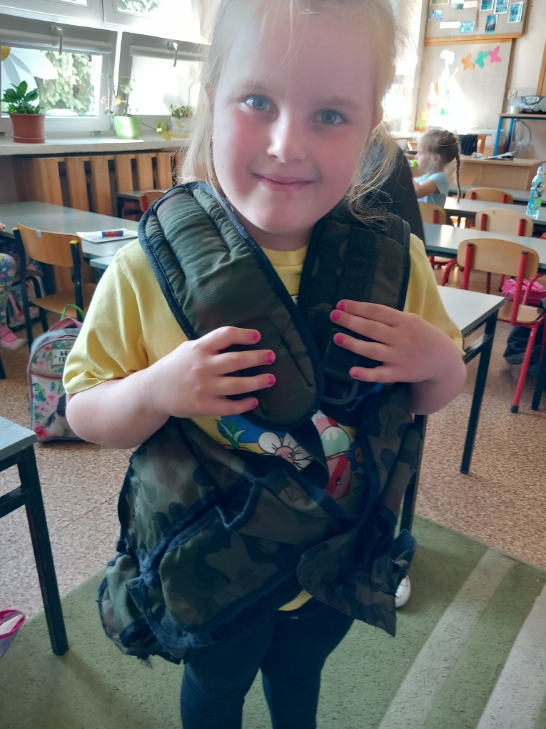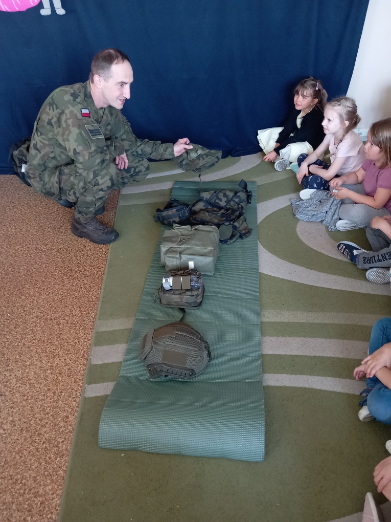 29 maja grupy przedszkolne gościły żołnierza z Jednostki Wojskowej w Leźnicy Wielkiej, pana Łukasza Kowalczyka, tatę Igi i Wiktorii. Pan Łukasz opowiedział dzieciom na czym polega jego praca, czym zajmują się żołnierze, jak ważna jest ich służba dla Ojczyzny, zaprezentował także mundur oraz podręczne wyposażenie żołnierza. Dzieci z wielkim zainteresowaniem słuchały wszystkich informacji. Dużą atrakcją dla przedszkolaków było także przymierzenie hełmu, maski przeciwgazowej czy kamizelki taktycznej.