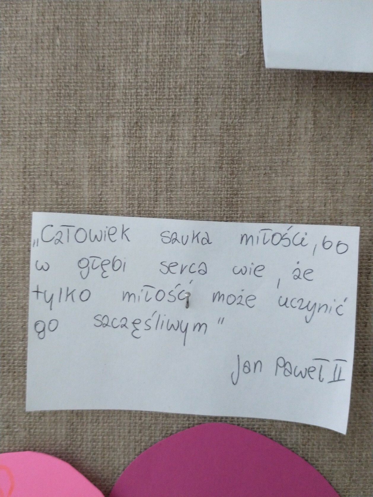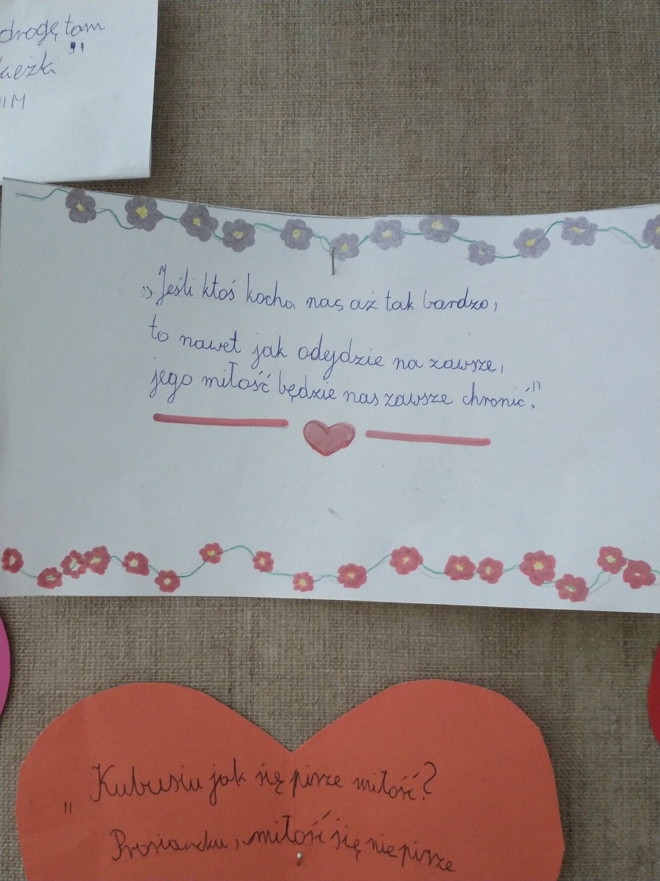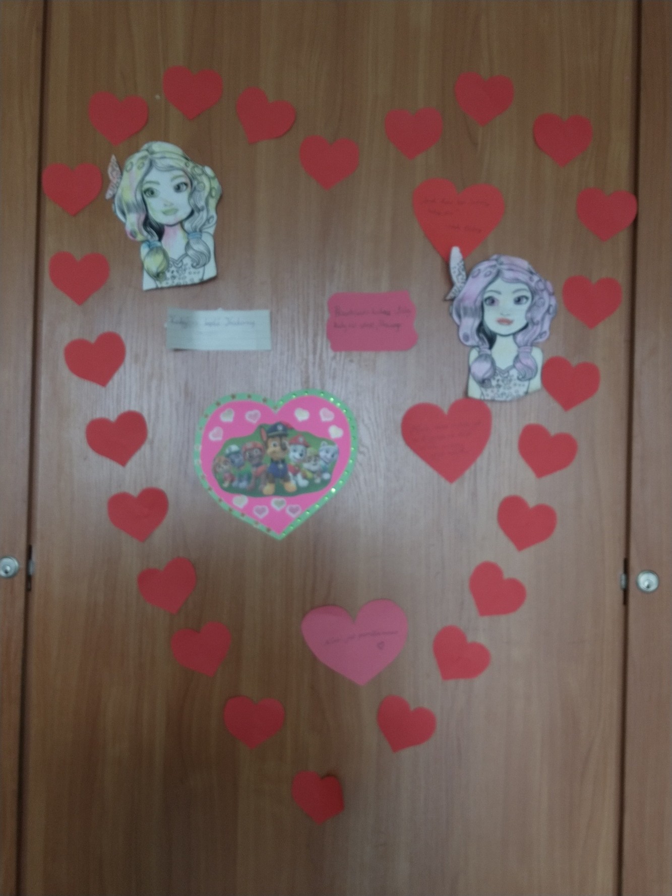 Nasi uczniowie również świętowali ten dzień. Była poczta walentynkowa, malowanie twarzy na przerwach, drobne upominki w postaci lizaków oraz dekoracje drzwi do klas. Jednak największego wzruszenia dostarczyły cytaty dotyczące miłości, które zostały umieszczone na szkolnych korytarzach.
