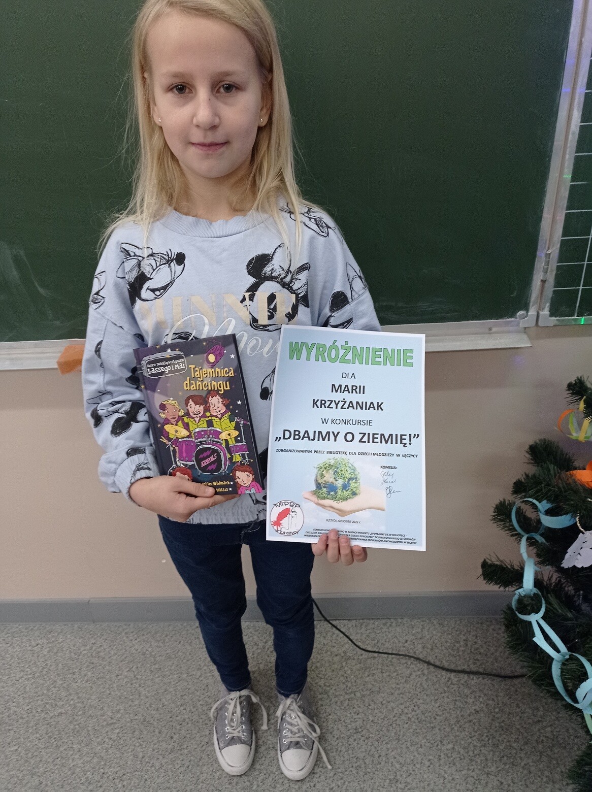 Uczennica klasy III, Marysia Krzyżaniak zdobyła wyróżnienie w konkursie "Dbajmy o Ziemię", który został zorganizowany przez Bibliotekę dla Dzieci i Młodzieży w Łęczycy. Zadaniem uczniów było wykonanie plakatu o tematyce ochrony środowiska wraz z hasłem wzywającym do proekologicznych działań.